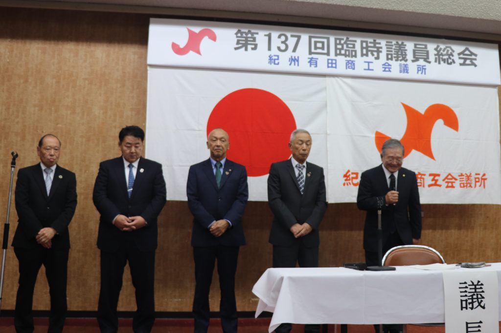 当商工会議所は、臨時議員総会を令和7年10月31日(金)、紀州有田商工会議所6階大ホールにて開催し、10月末日任期満了に伴う役員改選を行い、新会頭に秋竹新吾氏(㈱早和果樹園 会長・新任)、副会頭に岡本幹生氏(㈱上岡工業 代表取締役・再任)、児嶋正人氏(㈱KL 代表取締役・再任)、尾藤 佳氏(㈱紀州有田蒲鉾 代表取締役・新任)、専務理事に興津智博氏(新任)を選任いたしました。