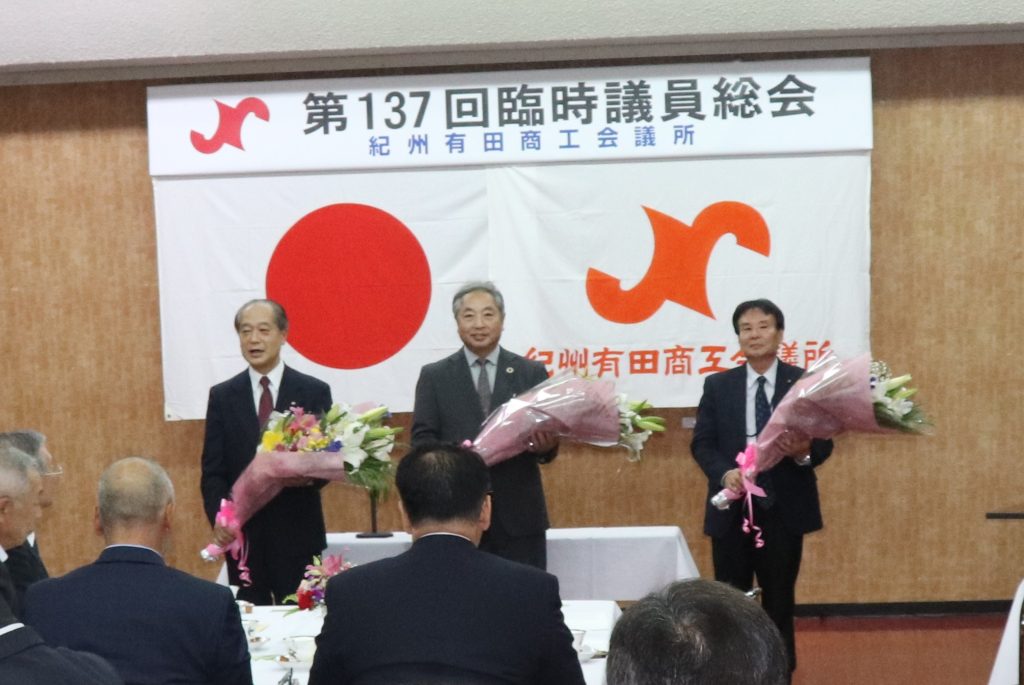 また、3期9年間、会頭を務められた川端隆也氏(日出手袋工業㈱ 代表取締役)、同じく3期9年間副会頭を務められた雑賀清秀氏(㈱雑治商店 代表取締役)、専務理事 栗山弘氏(紀州有田商工会議所)に、それぞれ花束が贈呈されました。